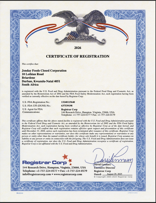 Certifications Halaal Certificate - 2025FSSC22000 Certificate of RegistrationCertificate of Registration